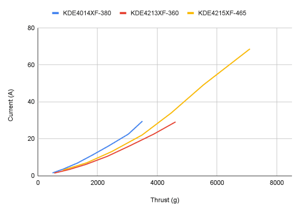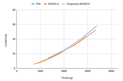 Next, I conducted a thorough analysis of existing motors and compared them based on the drone's maximum take-off weight (MTOW) of about 20 lb. I found lift motors between 100-1000 KV for large drone sizes at a comparable scale, because lower KV values deliver greater torque, as opposed to motors with higher KV values, which are suited for smaller drones. The thrust required to hover in a tricopter configuration is approximately 3024g per motor, meaning the selected motors must exhibit at least 3000g of thrust at 50-55% throttle, to allow room for a higher thrust-to-weight ratio while ensuring hover at fairly low throttle. Additionally, the selected motor must only be rated for 6S batteries or lower, following the competition requirements. The selected motor was determined to be the T-Motor P60.