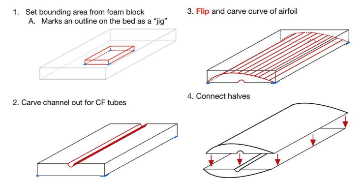 For the frame, carbon fiber rods were joined at angles using ABS inserts and epoxy resin. The foam body is CNC machined using a 4-step process to precisely shape two airfoil halves with an inner tube slot. Lastly, the landing gear were made using carbon fiber rods and recycled PLA skids from my other project, the Recycled PLA Center.