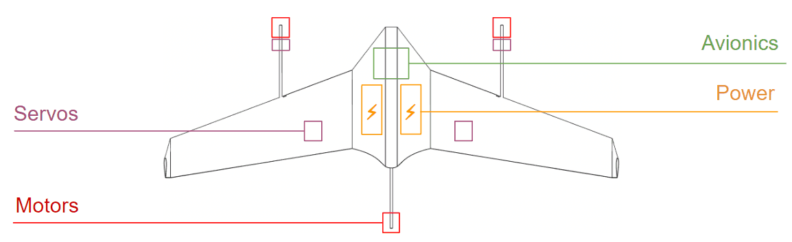 The competition course sets the design requirements: the drone needs to vertically take-off, transition to forward flight, travel 400m, turn around, travel 500m, turn around, travel 100m back to the landing zone, and land vertically. Additionally, the drone must carry as many 2-lb payloads as possible for additional points. Lastly, it must be able to perform the course autonomously.