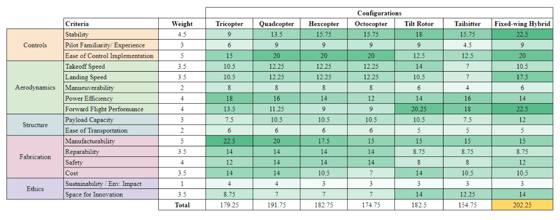 Since there are so many drone configurations to choose from, I created a weighted matrix to determine the best one for this competition and my team, factoring criteria like speed, forward flight performance, simplicity, and manufacturability.