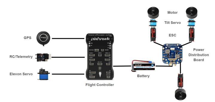 QGroundControl, an open source autopilot software, implementing a VTOL tricopter tilt-rotor control system on the aircraft is simplified with the built-in framework and commands.