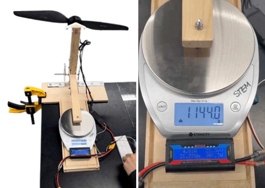 To validate the information given from the manufacturer, a simple thrust test stand was constructed using a wooden frame, motor mount, and weight scale. By varying current flow to the ESCs and attaching a wattmeter, the motor behavior due to the current and power supplied can be analyzed.
